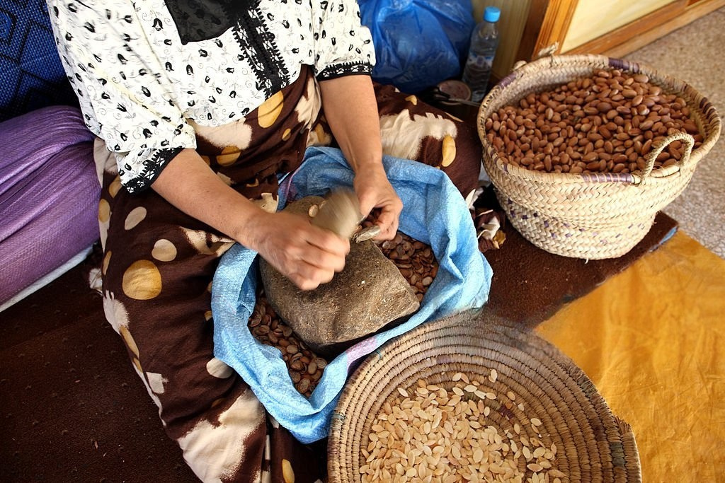 De olie wordt gewonnen in Zuidwest-Marokko, waar lokale vrouwencoöperaties de noten met de hand pellen en persen.